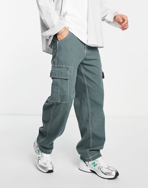 Bershka contrast stitch wide fit cargo pants in grey ASOS